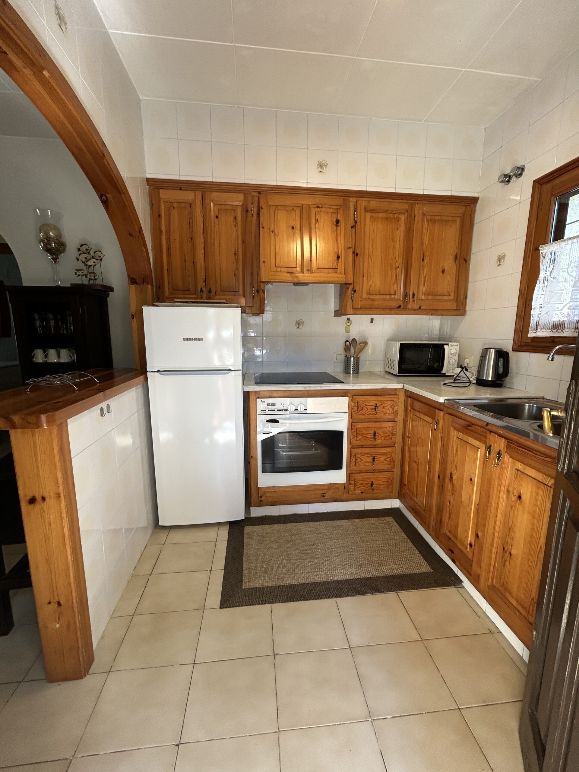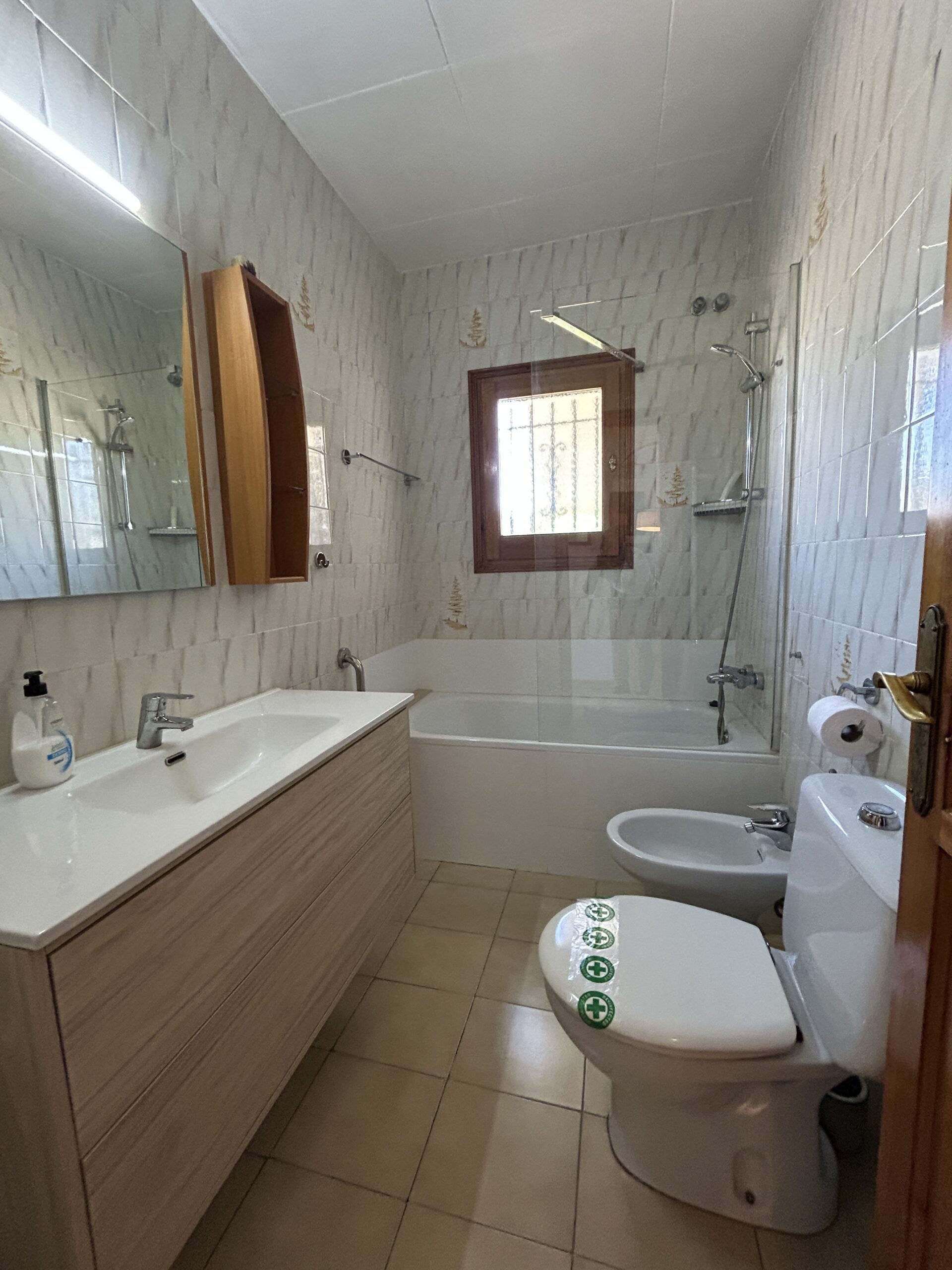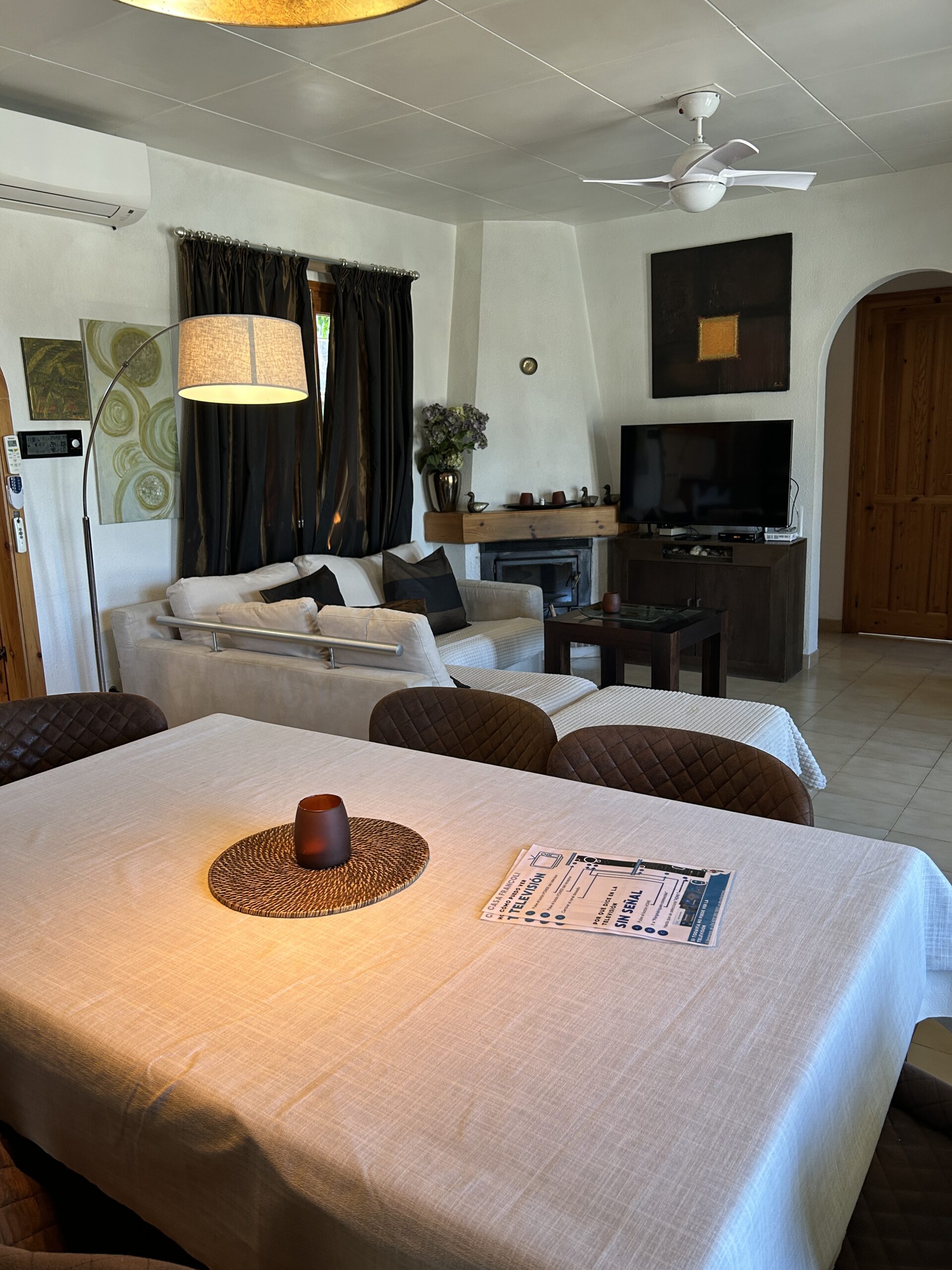 The house has a large living and dining room with a beautiful fireplace and a fully equipped fitted kitchen with ceramic hob, oven, extractor hood, microwave, dishwasher and refrigerator. From the living and dining area you can go directly to the pool. There are a total of 4 bedrooms in the house. Three bedrooms are furnished with a double bed. One bedroom has 2 bunk beds. There is a small bathroom with a shower and a bathroom with a tub. The house has satellite TV and a stereo system.