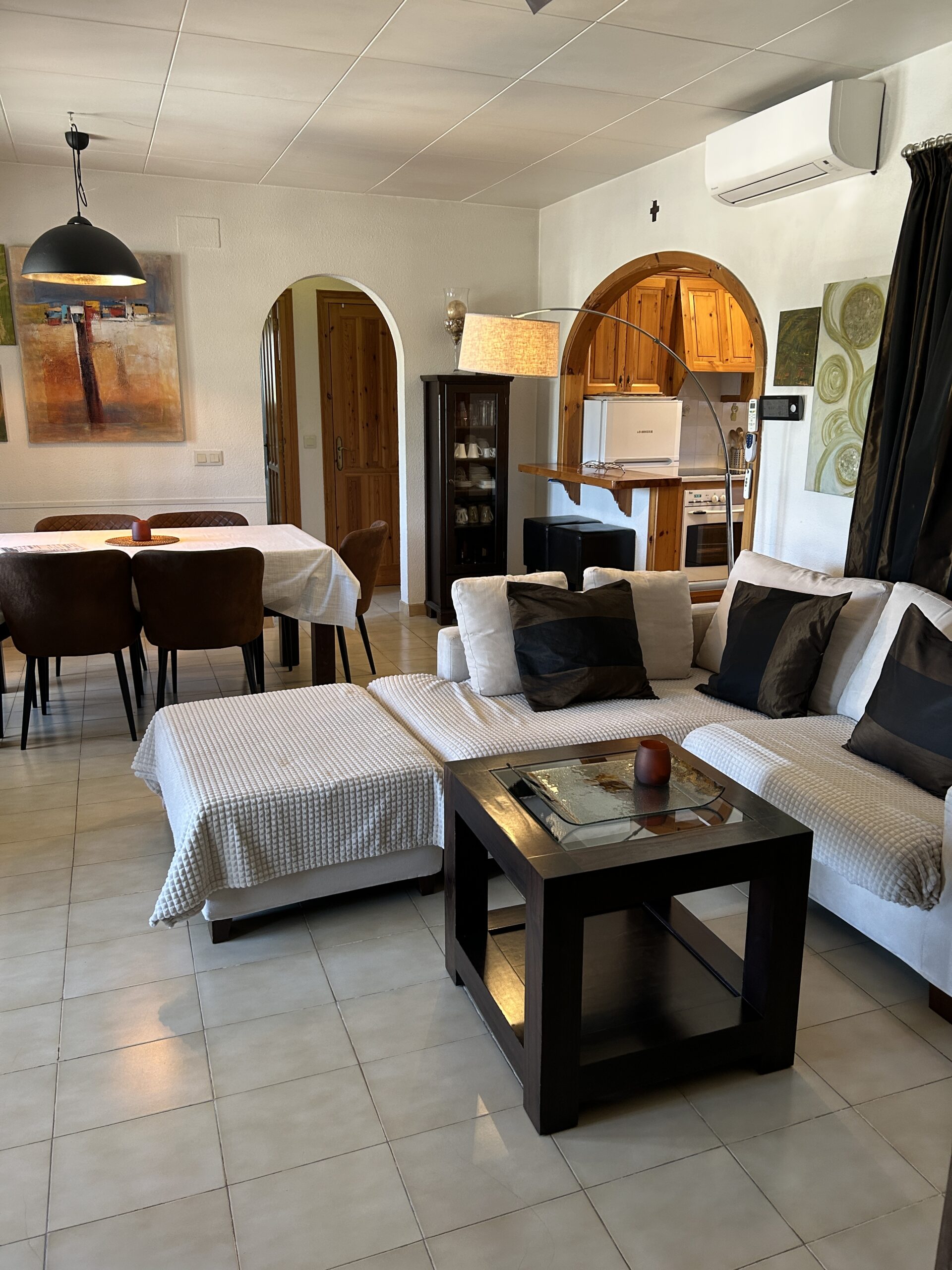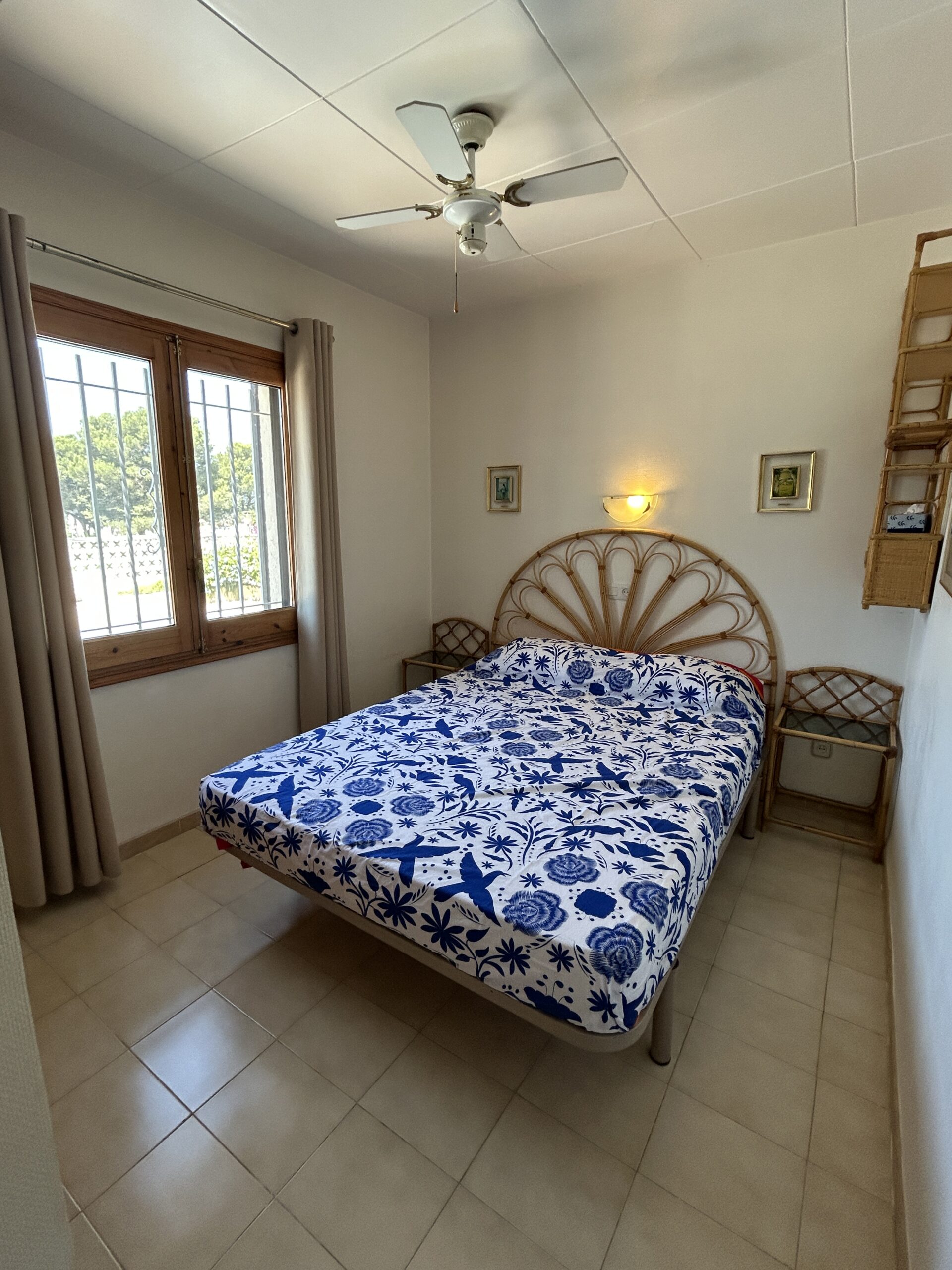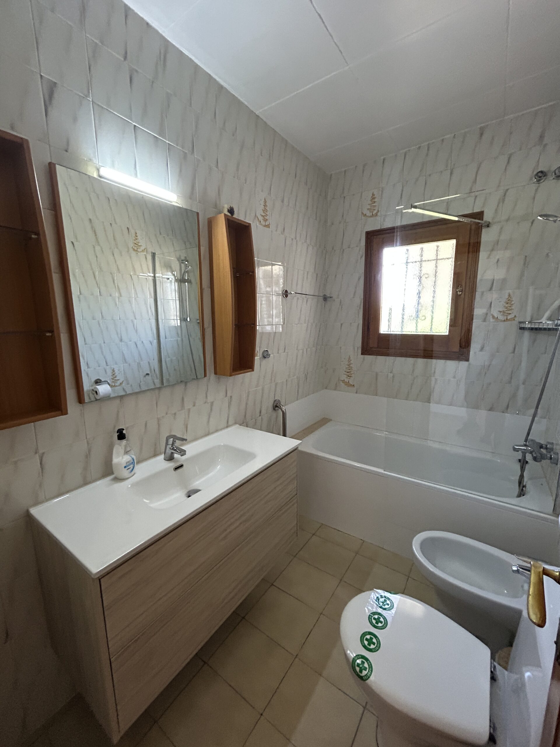 The house has a large living and dining room with a beautiful fireplace and a fully equipped fitted kitchen with ceramic hob, oven, extractor hood, microwave, dishwasher and refrigerator. From the living and dining area you can go directly to the pool. There are a total of 4 bedrooms in the house. Three bedrooms are furnished with a double bed. One bedroom has 2 bunk beds. There is a small bathroom with a shower and a bathroom with a tub. The house has satellite TV and a stereo system.