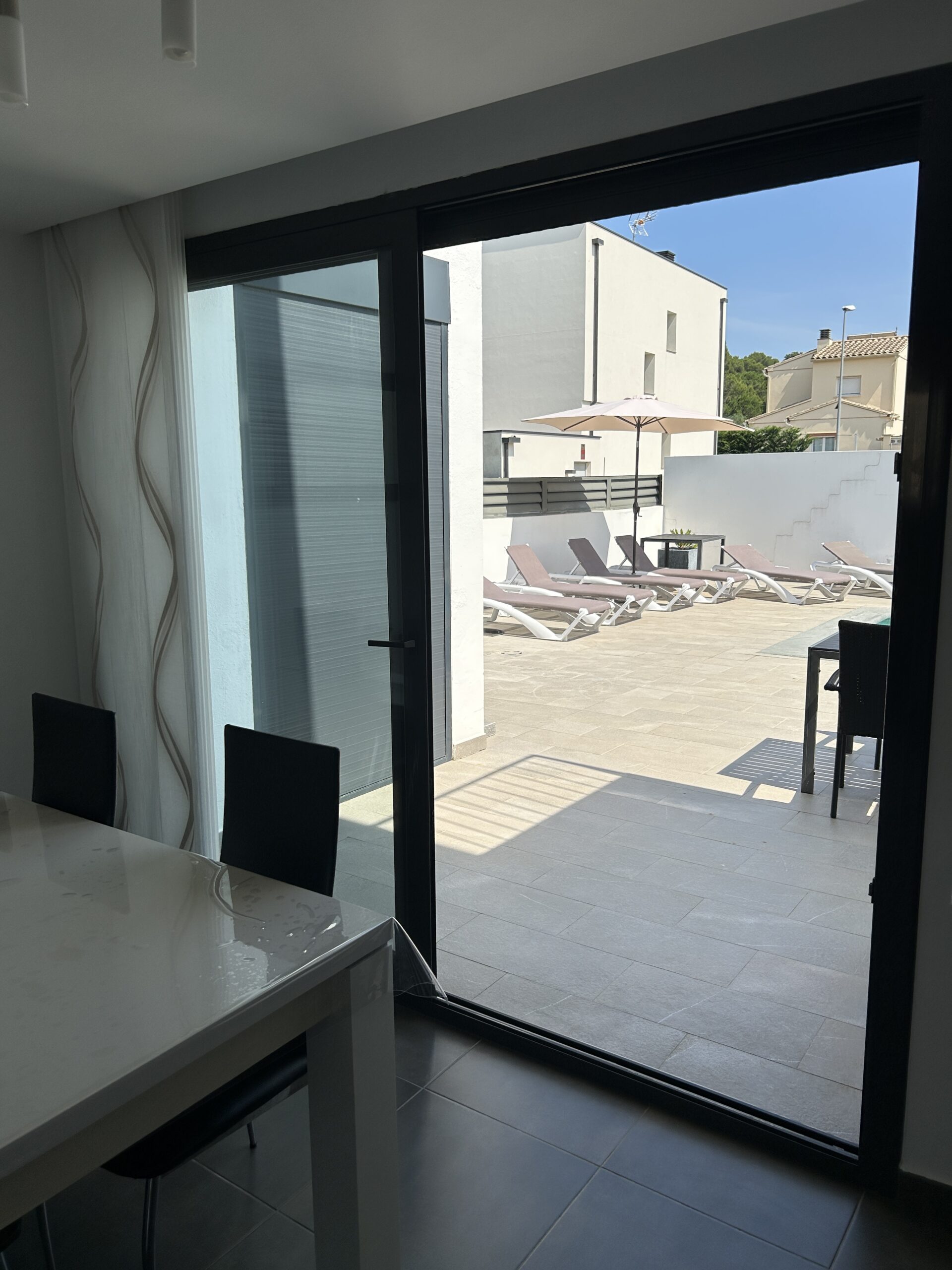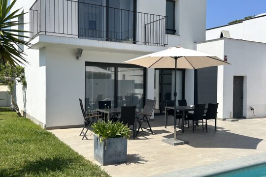 Desde el acogedor salón se accede directamente a la amplia terraza bañada por el sol, que invita a pasar horas acogedoras y momentos refrescantes junto a la piscina privada con cómodos escalones.
