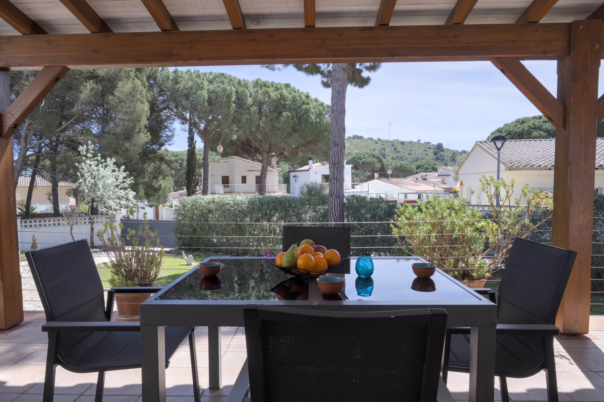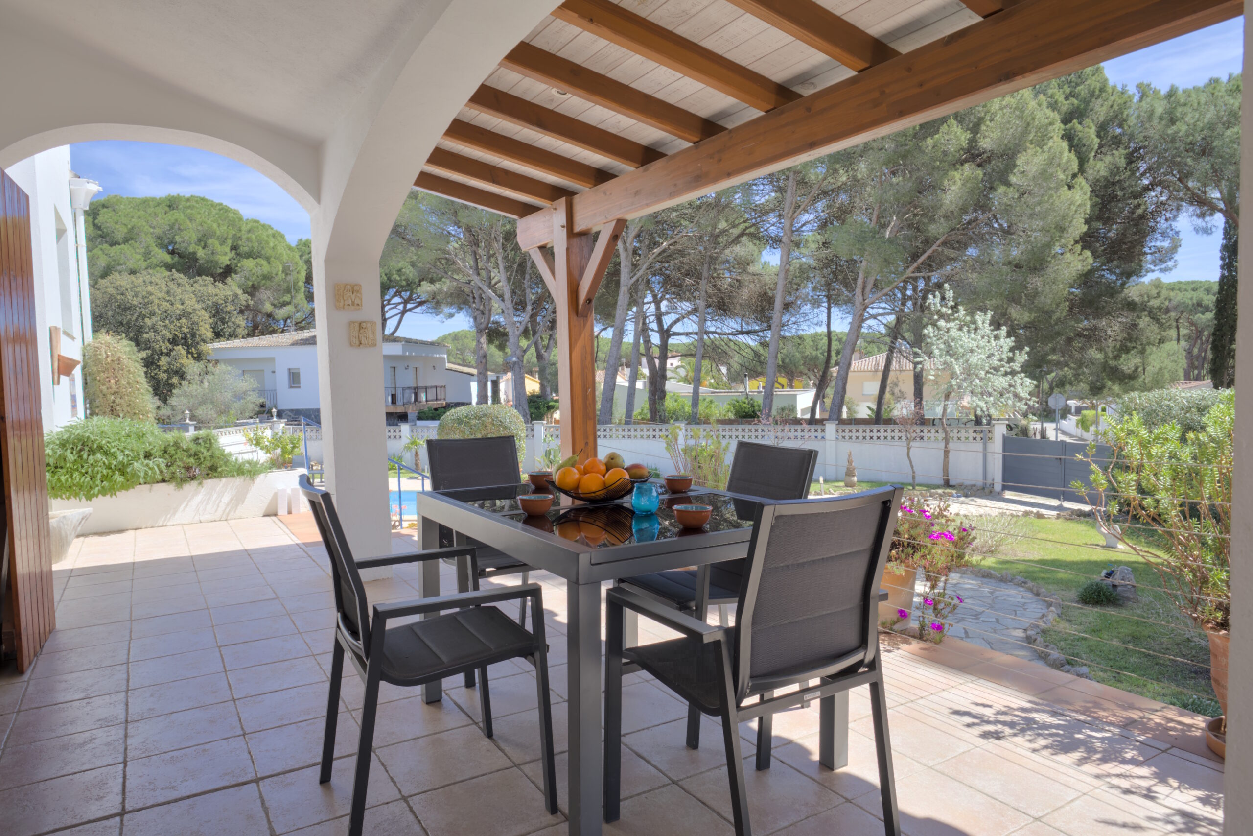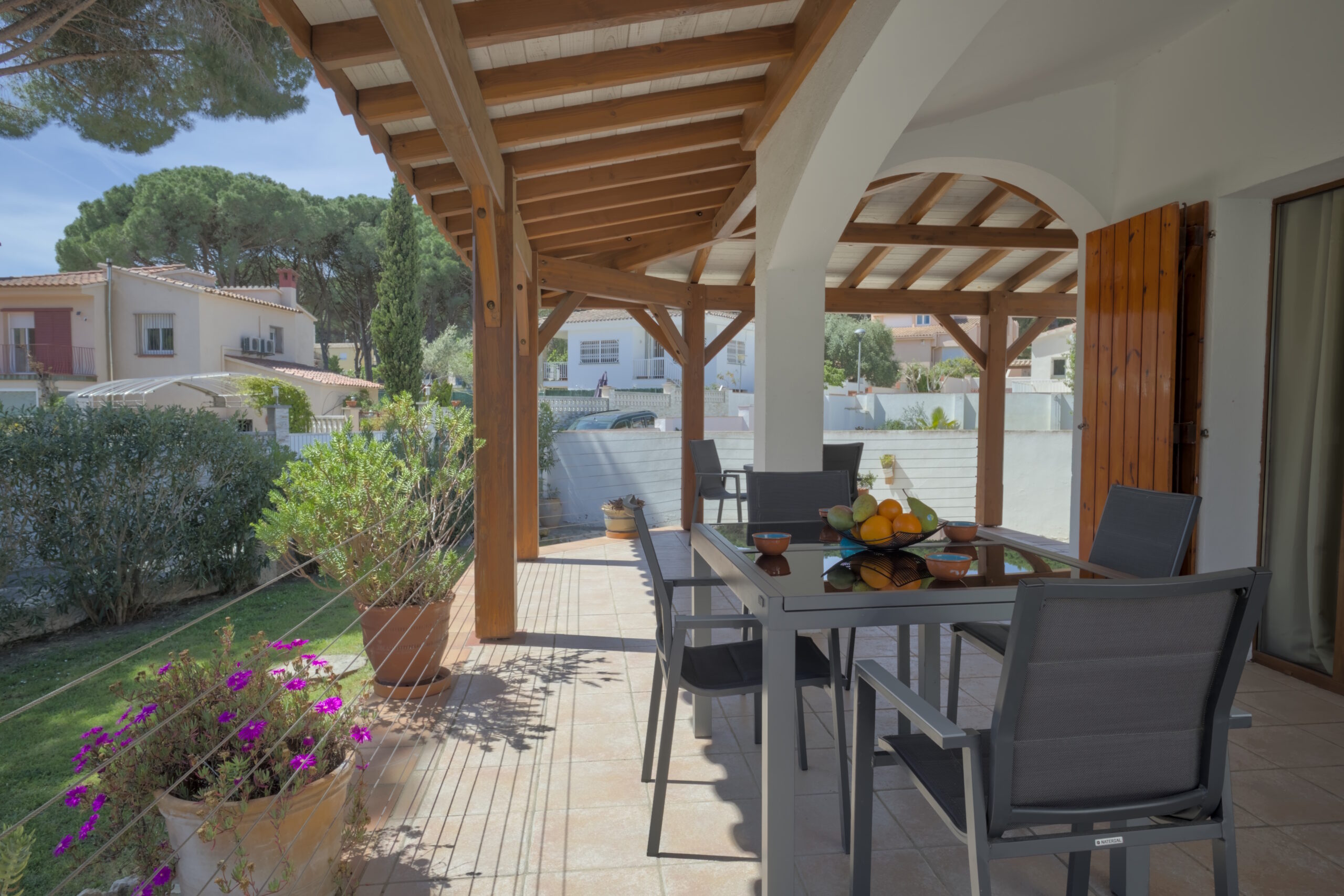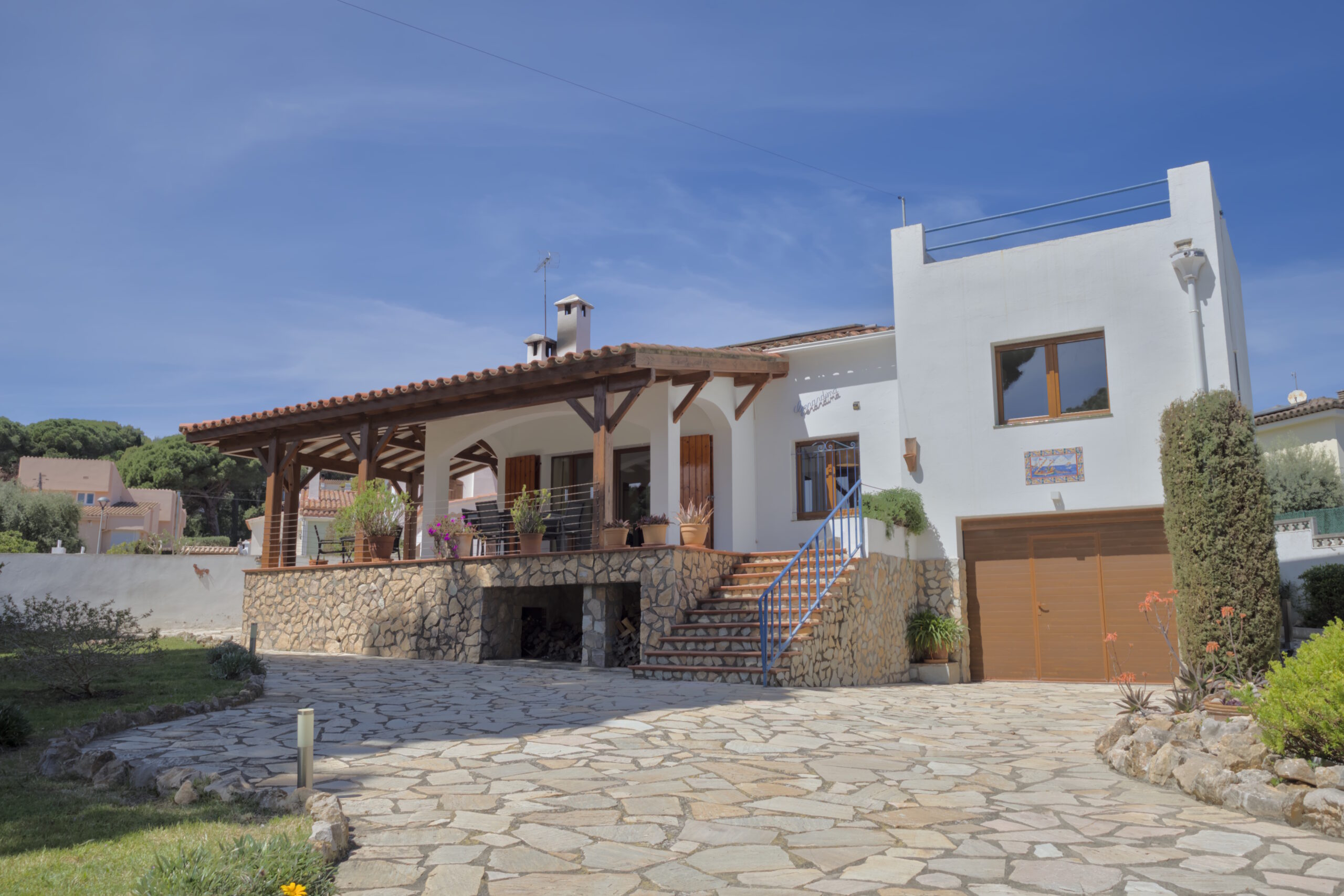 La propiedad de unos 776 m² está muy bien diseñada y completamente amurallada. La casa tiene una terraza preciosa completamente cubierta, en la que se puede sentar y disfrutar el día. Además, hay una barbacoa de ladrillo.