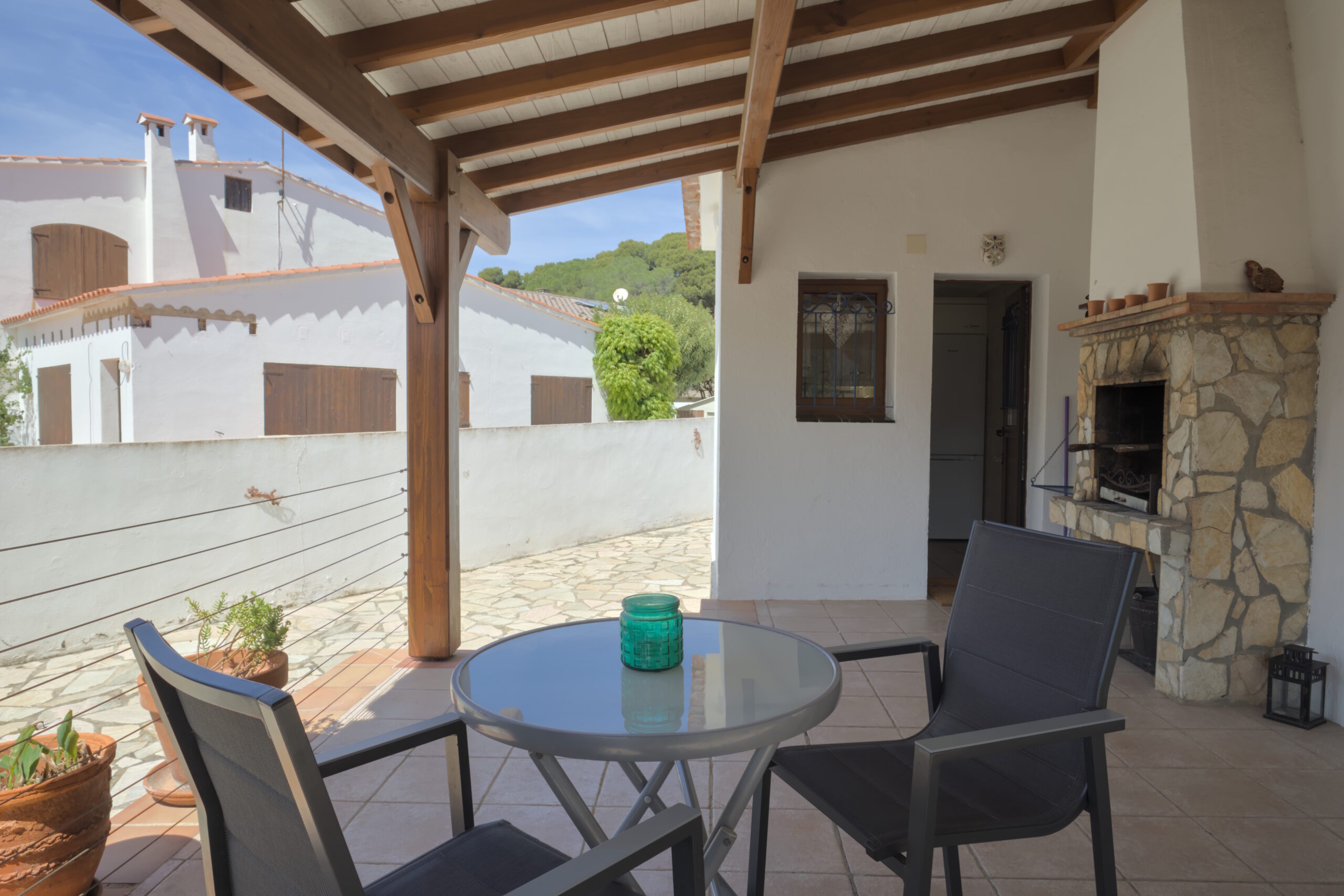 La casa tiene un salón con chimenea y un comedor. Desde el salón se accede directamente a la cocina totalmente equipada con cocina de gas, horno, campana extractora, lavavajillas y frigorífico. Hay un dormitorio con cama doble y uno con 2 camas individuales y armario doble. La casa tiene un baño con bañera y uno con ducha. La lavadora se encuentra en el trastero.