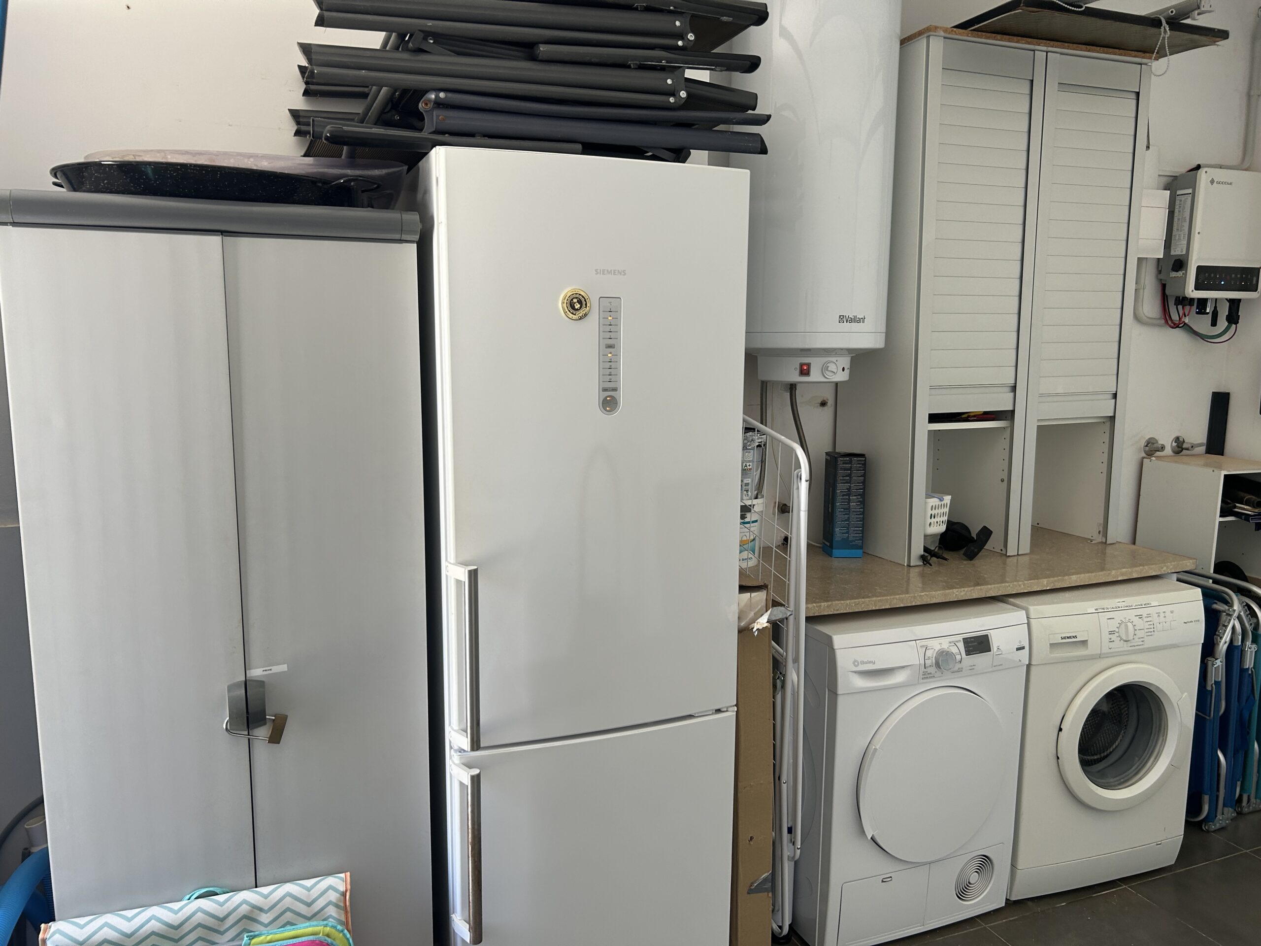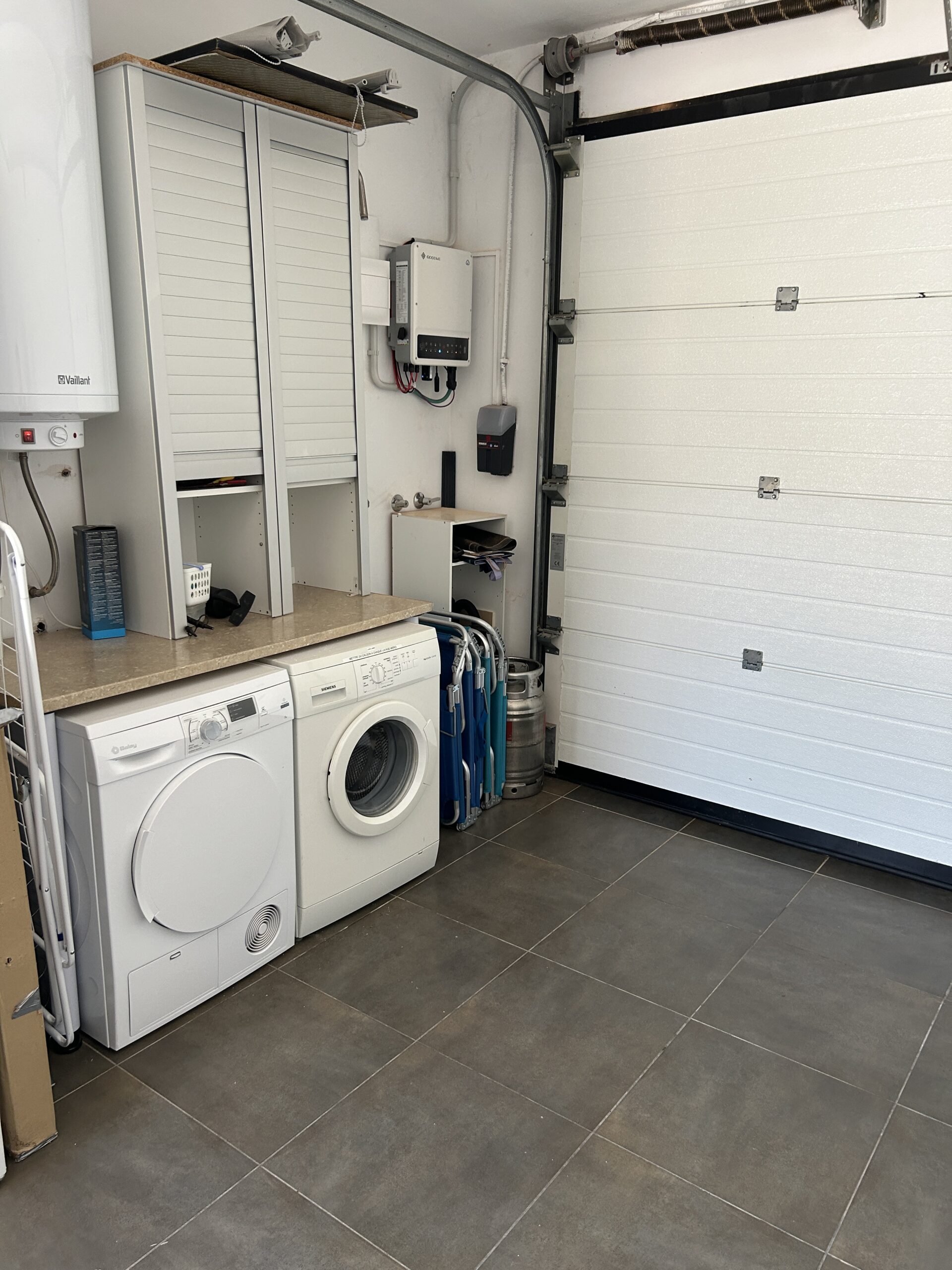 La grande terrasse est située sur un terrain de 500 m², qui donne également accès au garage. Vous y trouverez un lave-linge, un sèche-linge et un réfrigérateur supplémentaire pour encore plus de confort.