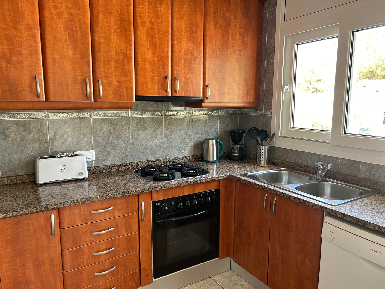 Cette maison de plain-pied dispose de quatre chambres doubles spacieuses et de deux salles de bains, l’une avec une douche et l’autre avec une baignoire. L’espace de vie spacieux comprend une cuisine ouverte avec une plaque de cuisson au gaz, un four, une hotte aspirante, un micro-ondes, un réfrigérateur avec compartiment congélateur et un lave-vaisselle. Il y a également une salle à manger et un salon, tous deux avec un accès direct à la terrasse depuis laquelle vous pouvez accéder à la piscine. Le WLAN et la télévision par satellite sont également disponibles.