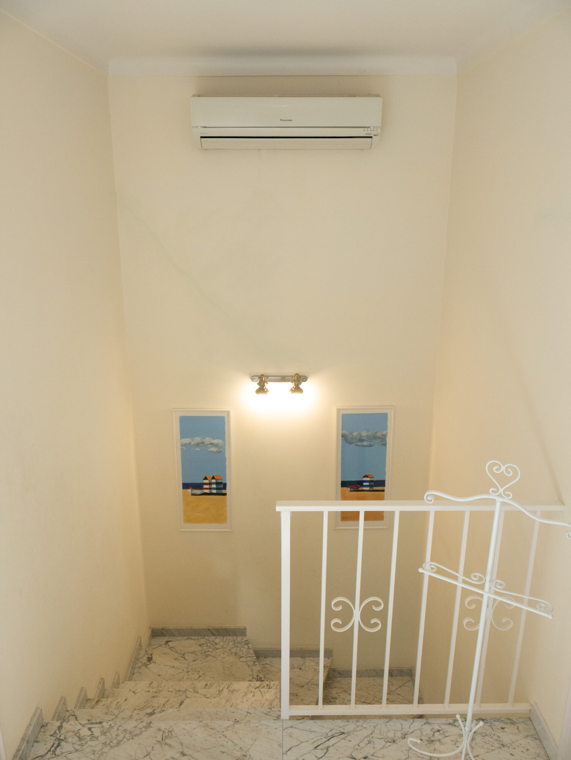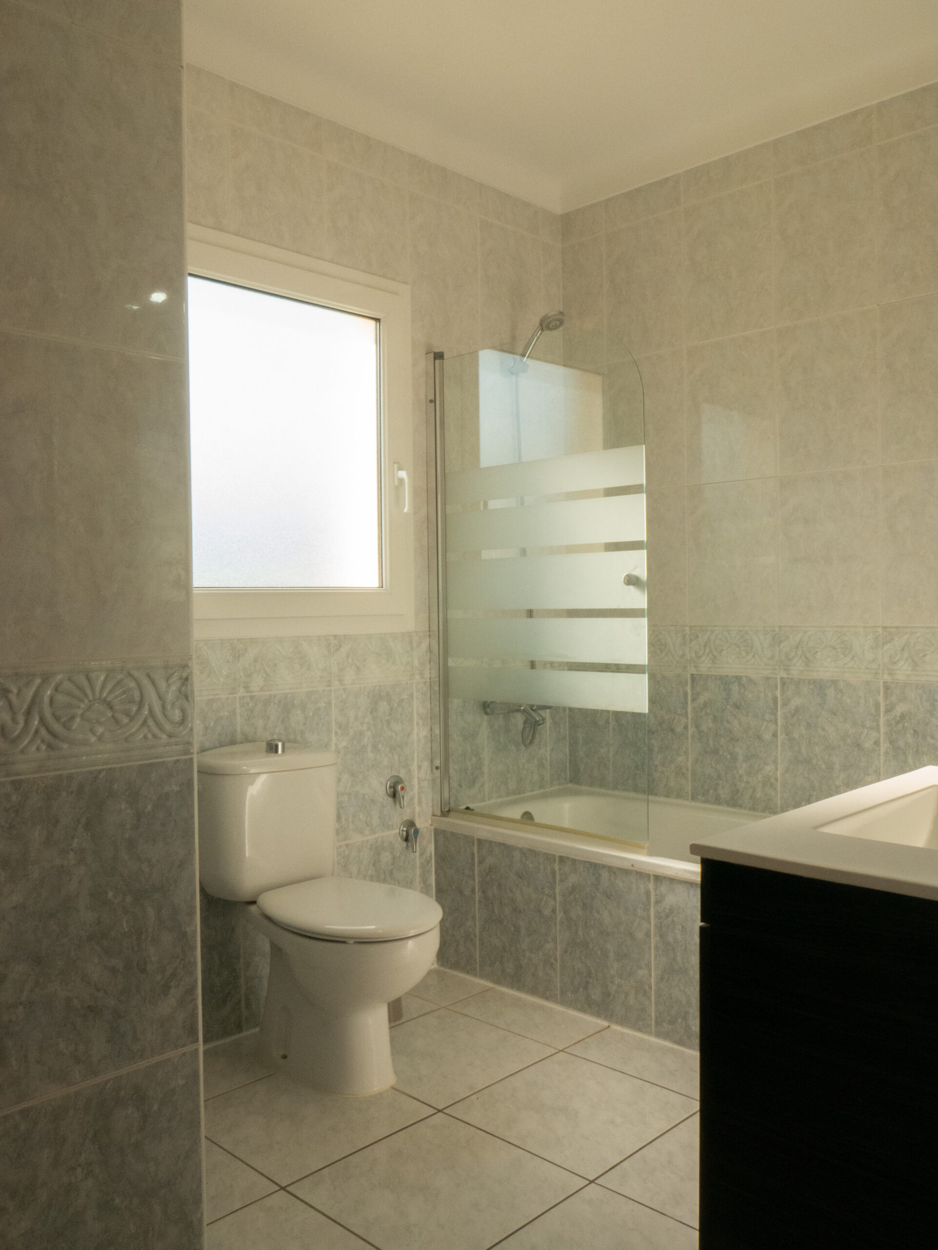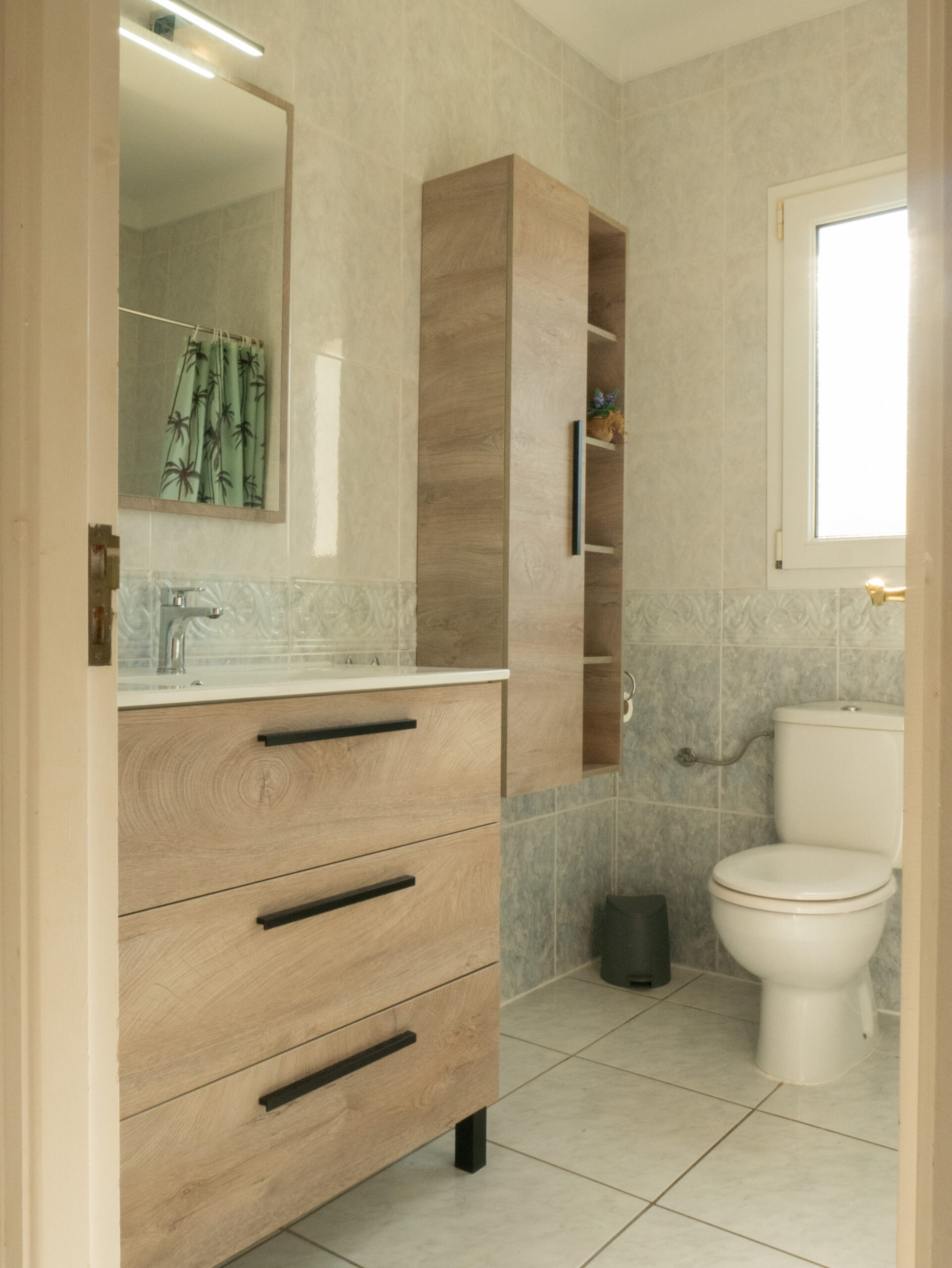 I1 chambre double avec balcon, une chambre de plus, une chambre des enfants avec une lit simple et lits superposés (3 lits), une salle de bains avec douche et une salle de bains avec baignoire sont à l’étage. Il existe des placards dans toutes les chambres.