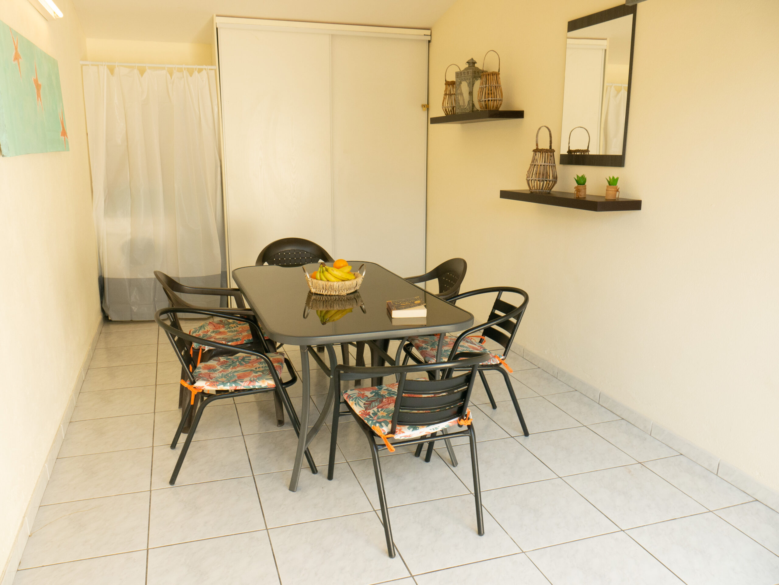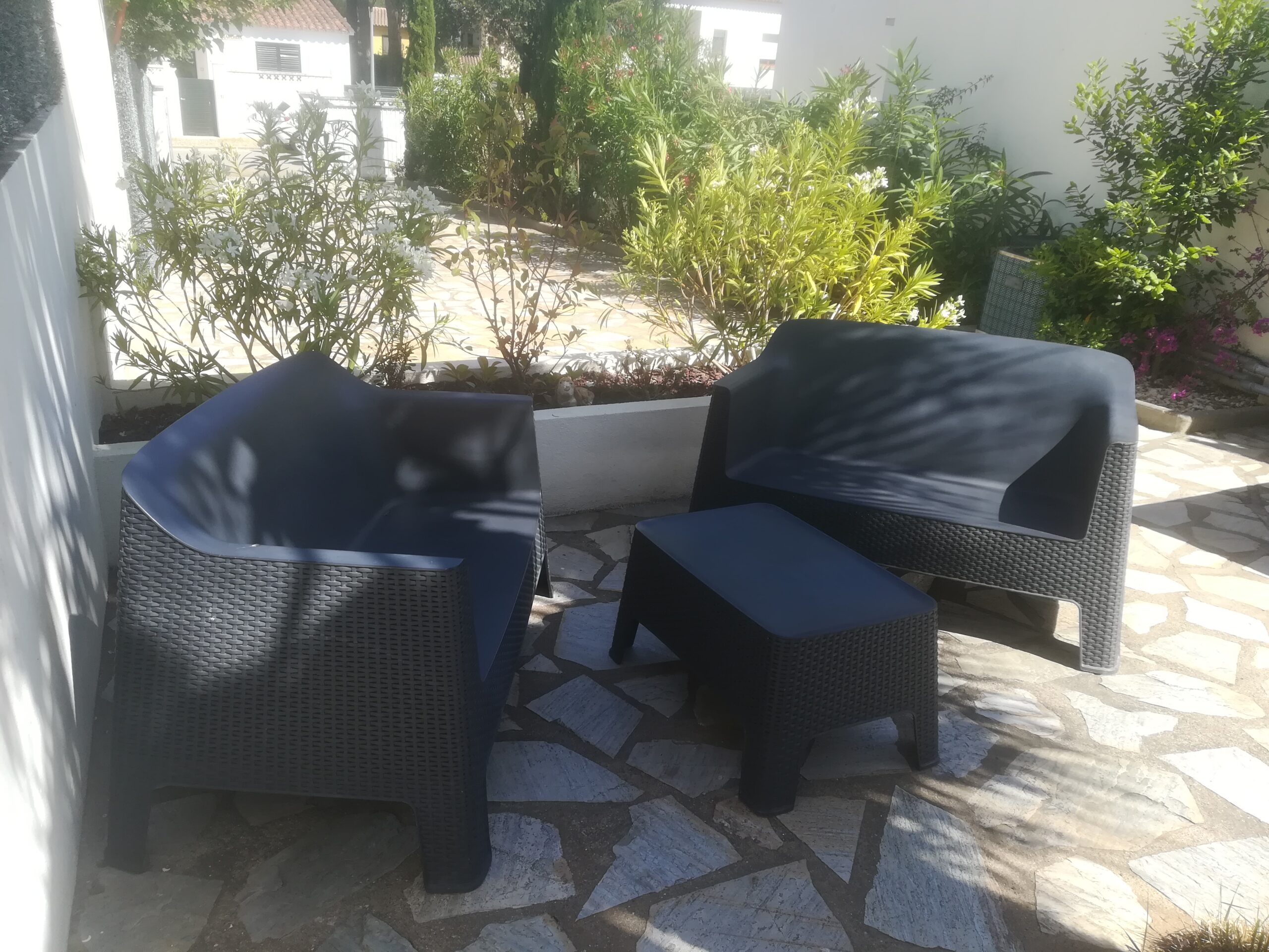 L’intrigue est pour la plupart pavée et dispose d’une piscine de 4 x8m. Il y a un coin salon confortable á côté d’un palmier.