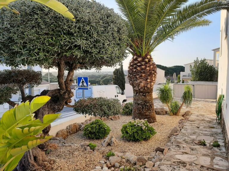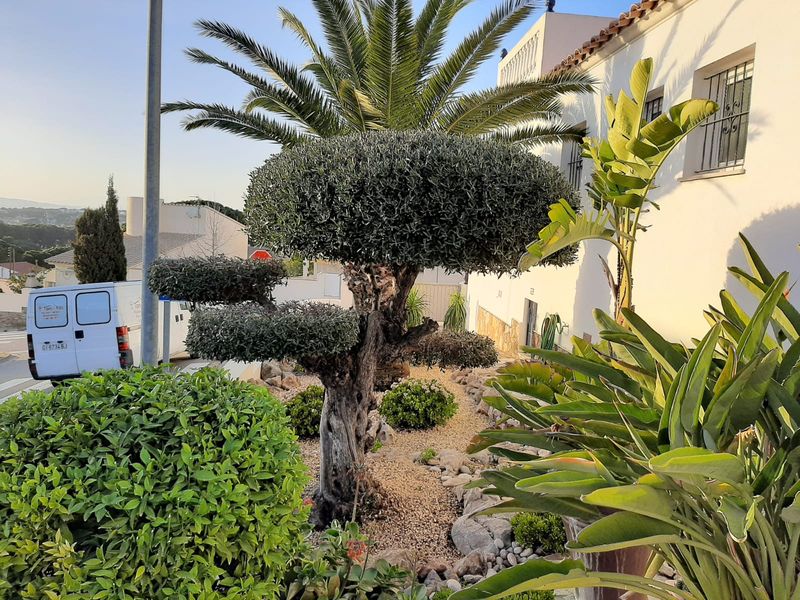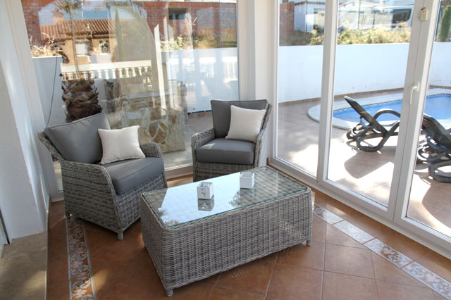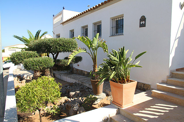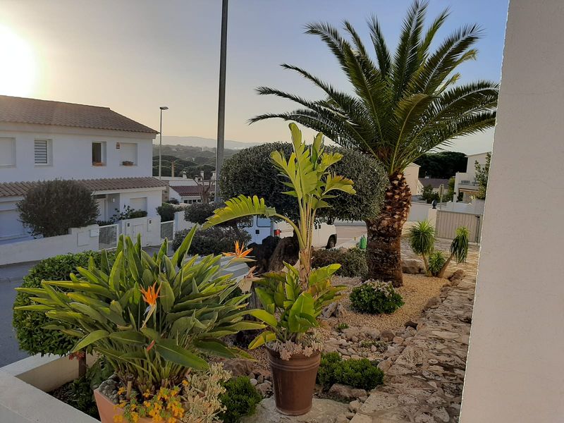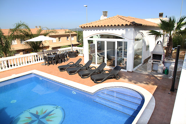 Das Haus ist umrandet von einem mediterranen Garten mit typisch spanischer Bepflanzung mit mehreren großen Palmen! Das Haus hat mehrere Sitzplätze sowie einen tollen sonnigen 8m x 4m großen Pool. Auf der Terrasse steht ein gemauerter Grill. Von der Dachterrasse kann man den Blick bis zu den Pyrenäen geniessen.