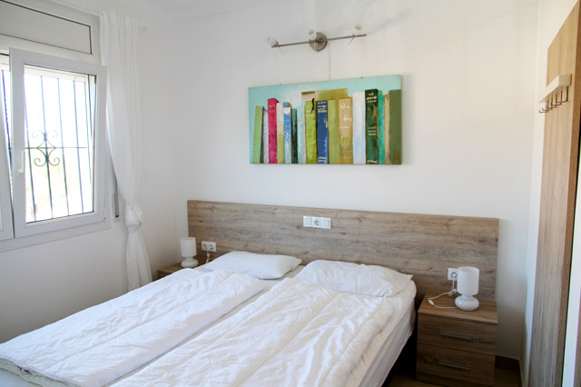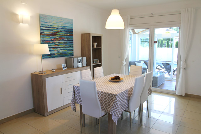Im Haus befinden sich ein großes Wohn- und Esszimmer mit einem schönen Kamin und einer komplett ausgestatteten offenen Einbauküche mit Ceranfeld, Backofen, Abzugshaube, Mikrowelle, Geschirrspüler und Kühlschrank sowie einer Kapsel-Kafeemaschine. An den Essbereich angrenzend ist ein gemütlicher heller Wintergarten mit Zugang zum Pool. Im Haus gibt es insgesamt 2 Schlafzimmer. Beide Schlafzimmer sind mit einem Doppelbett ausgestattet. Es gibt ein Badezimmer mit Badewanne und Dusche sowie ein separates WC. Das Haus hat Sat-TV und eine Stereoanlage.